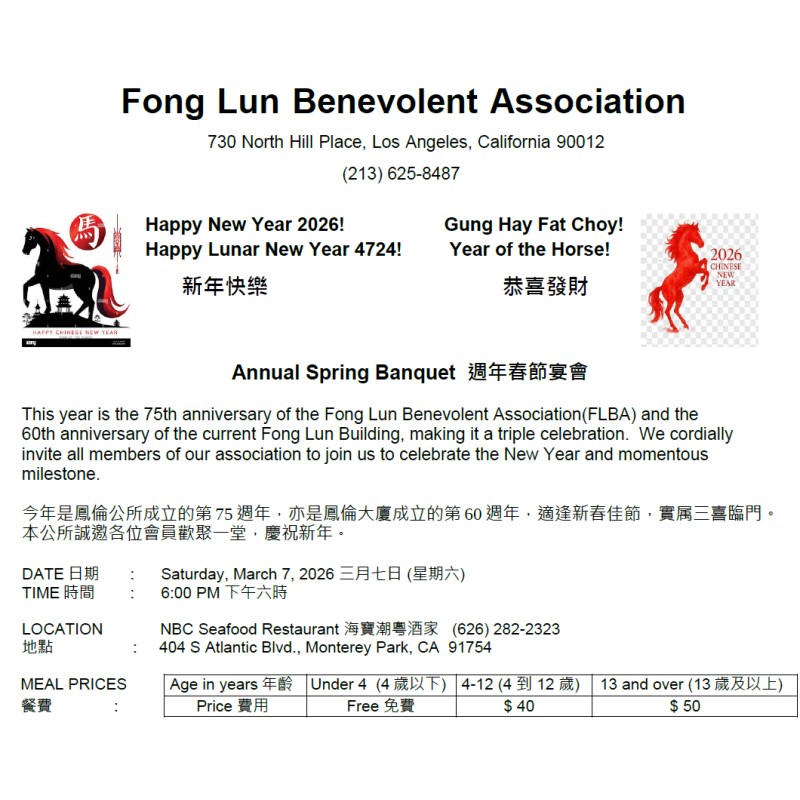 This year is the 75th anniversary of the Fong Lun Benevolent Association(FLBA) and the 60th anniversary of the current Fong Lun Building, making it a triple celebration. We cordially invite all members of our association to join us to celebrate the New Year and momentous milestone.